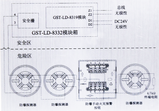 GST-LD-8332編址接口模塊(以下簡稱編址接口模塊)可與防爆設(shè)備(防爆感溫、感煙、煙溫復(fù)合探測器、防爆手動(dòng)報(bào)警按鈕等)配接,組成本安型防爆系統(tǒng)。一旦發(fā)生火災(zāi),編址接口模塊將報(bào)警信號通過總線傳入火災(zāi)報(bào)警控制器(以下簡稱控制器),控制器產(chǎn)生報(bào)警信號并顯示出編址接口模塊的報(bào)警地址信息。當(dāng)編址接口模塊本身出現(xiàn)故障時(shí),控制器將產(chǎn)生故障信號并顯示編址接口模塊故障地址信息。
