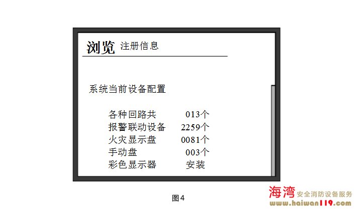 完成以上操作后,系統(tǒng)上電進(jìn)行初始化(畫面顯示如圖1所示)。初始化完成后進(jìn)入對運(yùn)行記錄、隔離信息、聯(lián)動公式、聲光電源的自動檢查狀態(tài)(畫面顯示如圖2所示),自檢完畢,控制器對外接火災(zāi)顯示盤、探測器和模塊進(jìn)行注冊(如圖3所示),并顯示注冊信息 (如圖4所示) 。至此,開機(jī)過程結(jié)束,系統(tǒng)進(jìn)入正常監(jiān)控狀態(tài)。主機(jī)鍵盤上設(shè)有“自檢”鍵,按下此鍵后系統(tǒng)將進(jìn)行和開機(jī)時相同的聲光及電源檢查。 關(guān)機(jī)過程按照與開機(jī)時相反的順序關(guān)掉各開關(guān)即可。要注意各個備電開關(guān)一定要關(guān)掉,否則,將有損壞電池的可能。