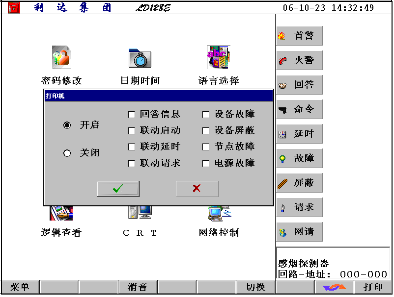 利達128E II火災報警控制器在本頁可完成打印機的操作。畫面下方顯示打印機當前狀態。