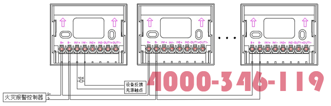“S+”、”S-”為總線端子,接入火災報警控制器;“IN1+”、“IN1-”接現(xiàn)場設備無源觸點的常開或常閉開關量信號,同時在被控設備的常開觸點上直接并接一個10K終端電阻。