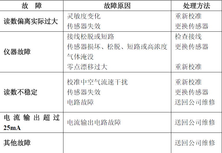 消防器材都有一定壽命的,在使用一段時(shí)間之后就會(huì)出現(xiàn)這樣或那樣的問題,有毒氣體探測(cè)器也是如此。安裝有毒氣體探測(cè)器,運(yùn)行一段時(shí)間之后,可能會(huì)出現(xiàn)一些常見的故障,下面這張表就將有毒氣體探測(cè)器的常見故障以及相關(guān)處理方法列舉出來了,僅供大家在遇到有毒氣體探測(cè)器故障時(shí)參考。